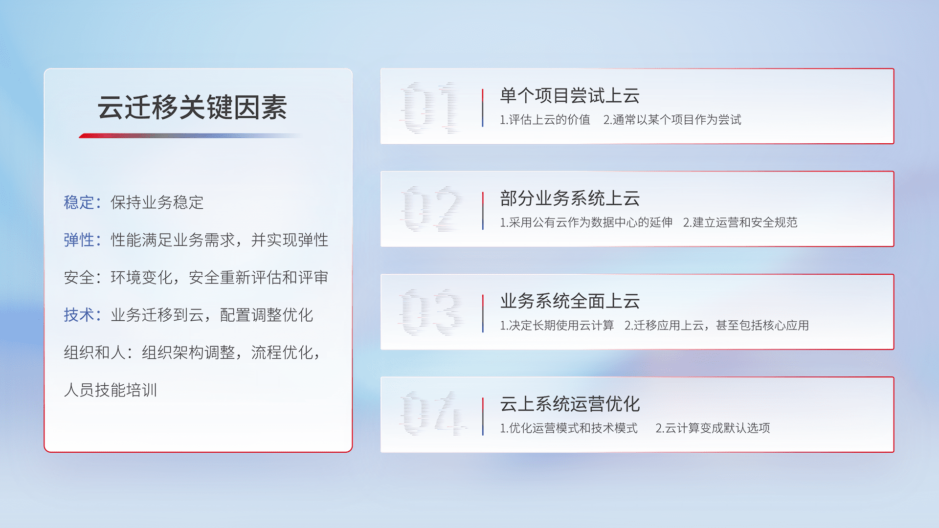 结合实际业务,,,从规划设计、、云平台选型、、、、云原生改造、、、数据迁移、、、集成交付,,,,迁移全过程为客户识别最佳上云路径,,,,做好风险识别管理,,设计网络架构、、、、身份权限、、、、安全审计合规、、、操作审计、、日志审计、、监控告警策略、、、、多站点容灾设计等,,对云上基础设施进行整体规划,,提升IT治理水平,,以满足弹性、、高可用、、、、高性能的需求。。