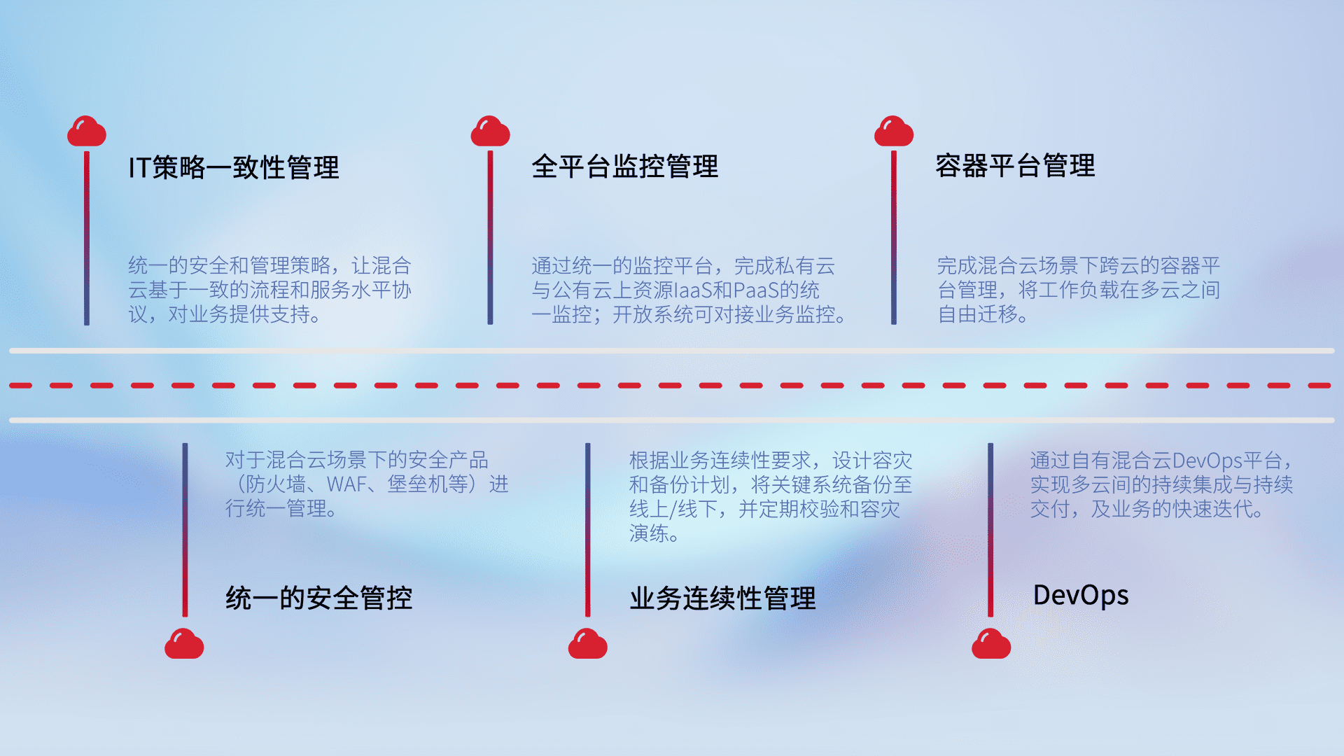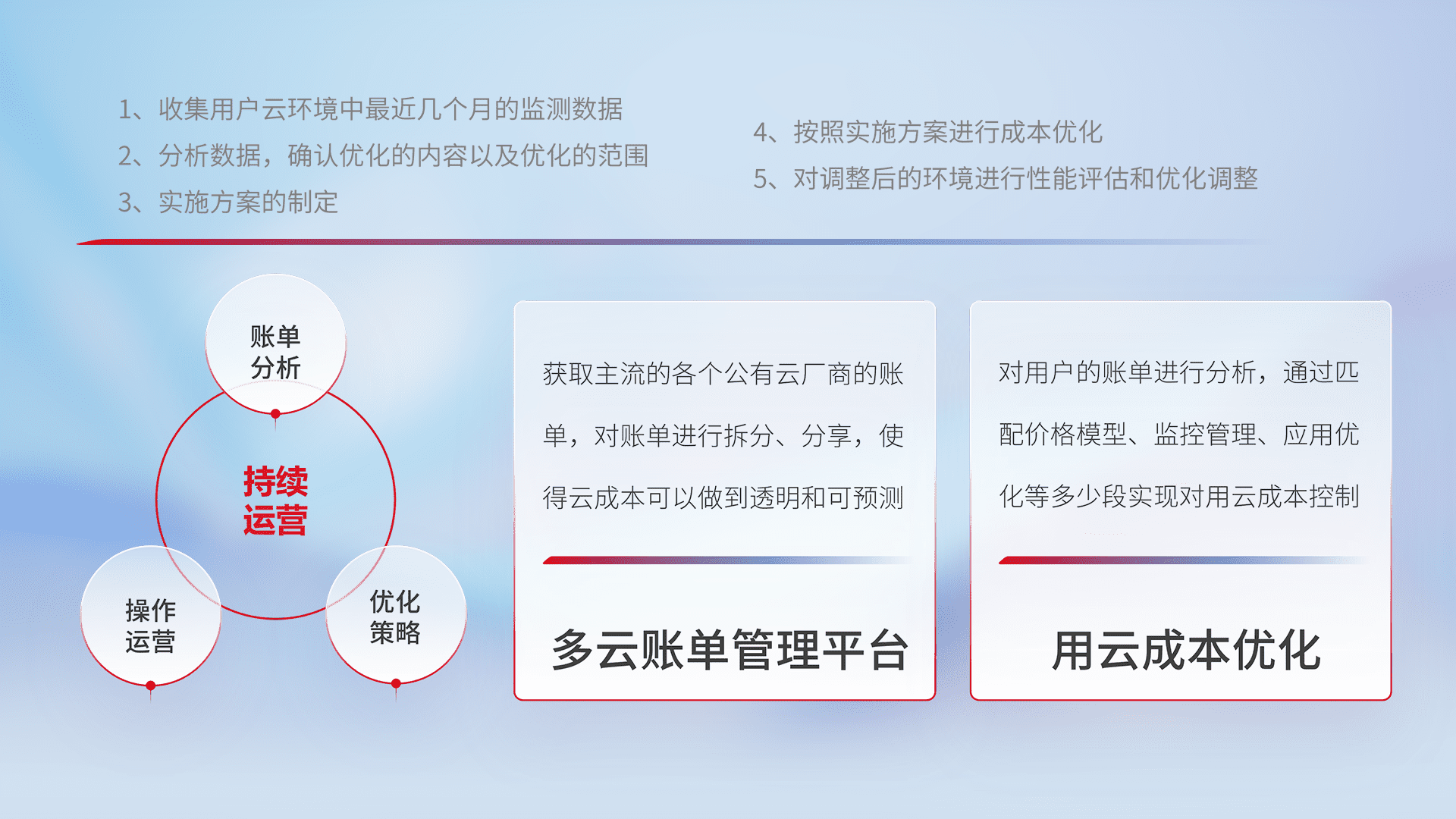 通过多云纳管,,以统一的资源数据模型把客户的云资源进行抽象和封装,,,进而实现对多云资源的统一操作,,,,保障云资源管理的可靠性、、、稳定性与可用性。。。量身定制化运维内容,,,配置、、、开发运维、、、补丁管理、、备份、、监控、、、、认证和访问管理、、、审计和日常巡检等,,保障在用云过程中的可靠度,,稳定度以及高可用率。。